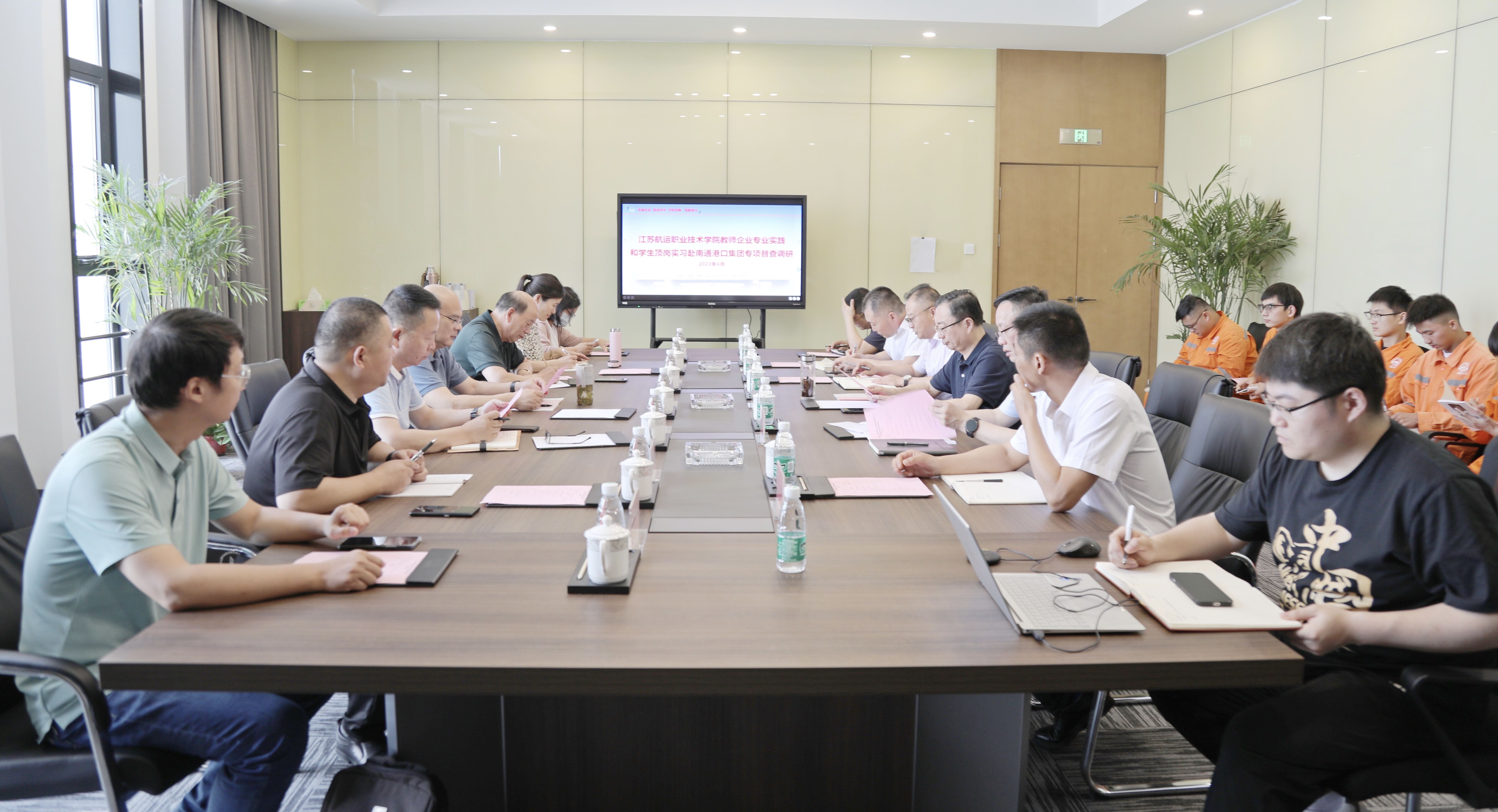 6月8日,集團黨委委員、副董事長崔劍及集團人力資源部、有關單位負責人與江蘇航運職業技術學院(以下簡稱“江蘇航院”)總督學施祝斌教授及校招生就業處、交通工程學院、運輸管理與經濟學院的負責同志和專家學者座談交流,雙方就如何進一步加強與規范教師進港口企業專業實踐以及學生進企業頂崗實習的有效管理,共同推動校企深度合作,攜手打造智慧港口產教融合共同體,及時了解指導師生實踐鍛煉等方面充分交換意見。